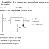 Este es el ejercicio de balances de materia con reacción química Entra 100gr CH4 gaseoso a un reactor el cual reacciona con O2, según la reacción CH4+O2--->CO2+H2O La composición de los gases de salida es molar Calcular lo siguiente a)Los moles de...