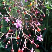 La vi en un jardín y me intereso. Tiene el tallo fino y oscuro con ramificaciones que terminan en sus flores rosas, al parecer no tiene hojas. Mando una foto por las dudas.