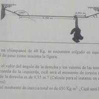 Es un ejercicio de un parcial de años anteriores pero no se como plantearlo bien En un zoológico un chimpancé de 40 kg se encuentra colgado en equilibrio de una barra uniforme de 200 N de peso como muestra la figura a ) Calcular el valor del angulo...