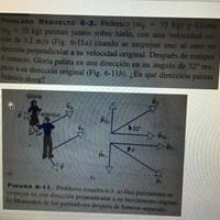 Federico (mF=n75 kg) y Gloria (mG=55 kg) patinan juntos sobre hielo, con una velocidad común de 3.2 m/s (fig.6-11a) cuando se empujan uno al otro en dirección perpendicular a su velocidad original. Después de romper el contacto, gloria patina en una...