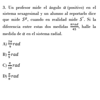 Si la diferencia de estas dos medidas es pi radial/45 grados , halle la medida de a en el sistema radial