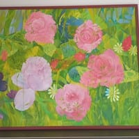 Está firmado y fechado por detrás en año 2000 Aparentemente representa flores, pero si analizas la imagen, descubres siluetas de personas y animales. Se titula La Naturaleza. Estoy intentando adjuntar la imagen, pero no lo consigo.