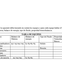 Hallar el balance de materia, energía, tipo de fluido, propiedad termodinámica básica de los equipos que se encuentran en la tab