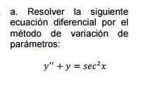 Resolver la siguienteecuación diferencial por elmétodo de variación deparámetros: