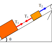 Plano inclinado, con tres masas, aceleración y tensión