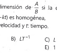 Halle la dimensión de — si laBecuaciónA=vcos[B-kt) es homogénea,donde v\ velocidad y t tiempo.