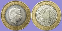 2 libras año 2003 Reino Unido Reina Elizabeth II (1982 - 2014) Aleación Bimetálica: centro de cuproníquel, anillo de níquel-latón Canto Grabado y estriado con leyenda Descripción del canto'STANDING ON THE SHOULDERS OF GIANTS' 12 gramos 28,4...
