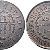 Moneda de Isabel II, 25 milésimas de 1868 . Copia, ¿Replica o buena?