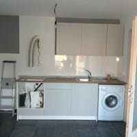 Colocar zócalo a cocina sin patas. La madera llega al suelo.