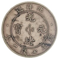 Fecha: 1907 Denominación: 7 mace 2 candareen Peso: 26,81 gramos Departamento: Asia del Este :Índice de Términos Dynasty: Qing Ubicaciones Geográficas: China Localidad: Hebei Anverso :: 33a AÑO DE Kuang Hsu; PEI YANG Reverso: dragón sentado Se intentó...