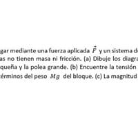 Un objeto de masa M se mantiene en lugar mediante una fuerza aplicada F ⃗ y un sistema de poleas.