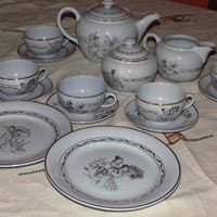 Juego de café o té marca Villeroy & Bosch. Sellos en parte inferior. Consta de 15 pieza (las tazas son dos piezas: plato y taza). Filo de oro. Decorado con figuras japonesas. En perfecto estado de conservación sin faltas. 60 años de antigüedad Valor...