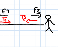 La tensión es 158 N. Pero las fuerzas pintadas en rojo no son la tensión de la cuerda; estas fuerzas las ejerce la cuerda sobre cada uno de los hombres. En resumidas cuentas, el hombre 1 hace una fuerza F1 sobre la cuerda, y en el otro extremo el...