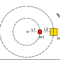 Un bloque de masa m1 = 3,4 kg. Está sujeto a una cuerda de longitud L1 = 2,8 m, fija por un extremo. La masa se mueve por un círculo horizontal soportada por una mesa pulida. Una segunda masa m2 = 9,9 kg. Se une a la primera por una cuerda de...