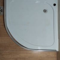 Aquí si coloco la guía contra la pared parecería ir bien, pero como al final va la guía lateral, oblicatoriamente tengo que separarla unos cm de cada lado, y como el semicírculo de la mampara no es igual al del receptáculo una parte queda fuera. Por...