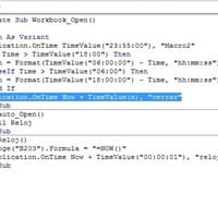 Yo necesito que se ejecute una macro a una determinada hora, utilice la aplicación On Time de la siguiente manera pegándola en el Workbook: Private Sub Workbook_Open() Application.OnTime TimeValue("23:59:00"), "Macro2" End Sub ¿Mi consulta es si solo...