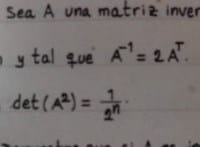 Sea A una matriz invertible de orden nxn tal que A^-1=2^T demuestre que dea(A^2)= 1/2^n