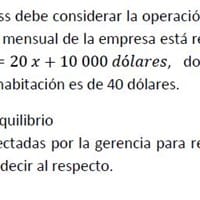 · 1) La utilidad son los ingresos menos los gastos I(q) = 8.35p C(q) = 7.2q + 2116 U(q) = 8.35p - (7.2q + 2116) = 8.35p - 7.2p - 2116 U(q) = 1.15q - 2116 Ahora sustitímos U(q) por la utilidad que nos dicen y calculamos q a) 4600 = 1.15q - 2116 4600 +...