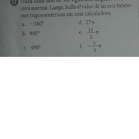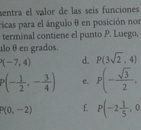 Funciones trigonométricas: solo son los 3 punto escritos Encuentre el valor de las seis funciones trigonométricas para el angulo en intentar normal si su lado terminal contiene el punto P. Luego, calcula el angulo en grados a: P (-7 , 4) b: P (-1/2 ,...