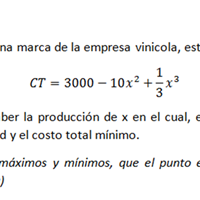 Empresa vinícola Con base en la revisión de los contenidos de la unidad da solución al siguiente planteamiento: La función de C(q) de una marca alimenticia de la empresa vinícola, está dada por: C(x) = 300 – 10 x^2 + (1/3) x^3 El gerente de marca...