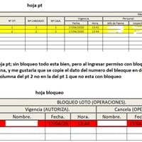 Como explico en la imagen, tengo este problema ya que no he podido resolverlo, tengo esta hoja llamada pt y otra llamada bloqueo, pero no he podido que al ingresar datos con bloqueos, me muestre el numero de bloqueo (nºloto) de la hoja bloqueo, en la...