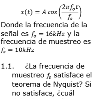 Se tiene una señal analógica_ Donde la frecuencia de la señal es y la frecuencia de muestreo es ¿La frecuencia de muestreo satisface el teorema de Nyquist? Si no satisface, ¿Cuál debería ser la frecuencia de muestreo adecuada? Adjunto imagen