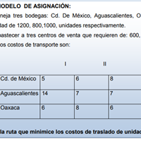 MODELO DE ASIGNACIÓN: Telmex maneja tres bodegas: Cd. De México, Aguas calientes, Oaxaca. Con una capacidad de 1200, 800,1000, unidades respectivamente. Debe de abastecer a tres centros de venta que requieren de: 600, 1000,1400, unidades. Los costos...