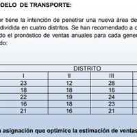 MODELO DE TRANSPORTE: Un distribuidor tiene la intención de penetrar una nueva área de mercado. La zona ha sido dividida en cuatro distritos. Se han recomendado a cinco gerentes se ha estimado el pronóstico de ventas anuales para cada generante en...