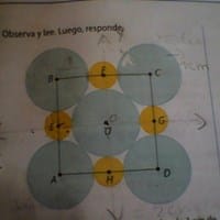 La figura muestra cinco círculos grandes de 1 cm de radio con centros en A coma espacio B coma espacio C coma espacio D espacio y O; cuatro círculos pequeños de igual radio que tienen puntos en común con tres de los círculos grandes, ¿Cuál es la...