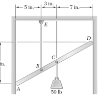 Ejercicio. Equilibrio de cuerpos rígidos Una barra ligera AD se encuentra suspendida de un cable BE y sostiene un bloque de 50 lb en C. Los extremos A y D de la barra están en contacto con paredes verticales sin fricción, Determine la tensión en el...