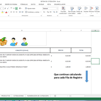 Que tal quisiera ver si me podrían apoyar con lo siguiente: Tengo una plantilla de excel donde estoy desarrollando un sistema de cotización. Entones en el área de conceptos, quiero que la columna de TOTAL (F) vaya calculando y poniendo el resultado...