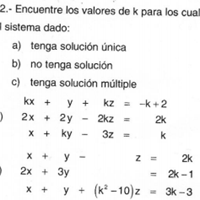 Como puedo encontrar los valores de K con las 3 soluciones de las ecuaciones no homogéneos. Es decir a) tenga solucion unica b)no tenga solucion c)tenga solucion multiple Ya acomode las matrices pero no entiendo como llegar a las tres soluciones ya...