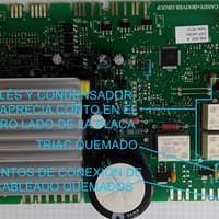 Tengo un problema de cortocircuito en la placa de potencia de una lavadora-secadora Hoover Otsein módelo WDYN 117468P - 37. Muestro la placa en cuestión y los componentes y pistas que se han quemado por el cortocircuito. Ya tengo un módulo nuevo,...