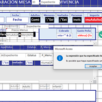 Tenemos un formulario F_ComidaConvivencia" con un subformulario continuo "FC_MesasComida", dependiente de la tabla T_MesasComida, emparejado con el formulario principal por el campo "Expediente". En el subformulario hay una casilla de verificación...