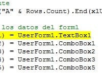 Tengo dos formularios VBA, en donde en el primero se cargan datos y en el segundo más datos, y quiero que lo que escribo en ambos se cargue en una misma fila de excel. Formulario 1 Private Sub CommandButton1_Click() Sheets("hoja1").Activate...