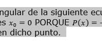 El punto singular de la siguiente ecuación ordinaria y´´-x^(-1) y´+x^(-2) y=0 es x_0=0 PORQUE P(x)=-x^(-1) y Q(x)=x^(-2) no est