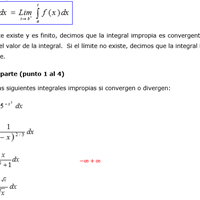Si el límite existe y es finito, decimos que la integral impropia es convergente, donde el límite es el valor de la integral. Si el límite no existe, decimos que la integral impropia es divergente. Nesesito saber la integral t si converge o diverge...