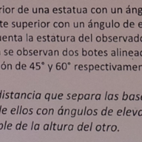 Quisiera que me ayudaran a resolver estos dos ejercicios de Triángulos, aparentemente son Triángulos rectángulos. 1.- Un observador ve la parte superior de una estatua con un ángulo de elevación de 30º. Camina 10m hacia la estatua y ve la parte...