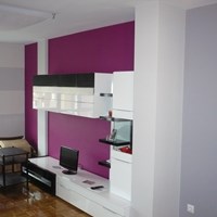 Si tu salón tiene poca luz debes de pintar colores suaves. Un color gris claro te quedaría fenomenal, dado que te dará luz y amplitud, además de que te quedará muy bien con el blanco y el nogal de tu mueble. Testero creo que te refieres a una columna...