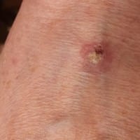 Slds cordiales, seria bueno que se te realice un cultivo del raspado de esa lesión, además de un chequeo general para ver como andas de todos tus parámetros sanguíneos, con ello sin lugar a dudas estarás en condiciones de recibir un buen tratamiento...