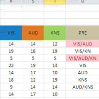 Tengo cuatro columnas: R-S-T-U en donde R corresponde a visual, S a auditivo, T kinestésico y U a preferencia, de tal manera que la suma de las filas R8:T8 me de la preferecia en la columna U, quiero que me aparezca VIS, AUD, KNS, VIS/AUD, VIS/KNS,...
