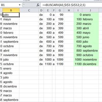 Pongo el ejemplo adjunto: Se usa la fórmula BUSCARV con el tercer argumento un 1, importante y la tabla (I1:J12) en orden ascendente. En B1 =+BUSCARV(A1;$I$1:$J$12;2;1)