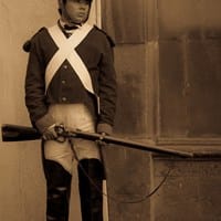 Que tipo y cual es el nombre de los textiles y materiales que se utilizan, tanto para poder confeccionar el uniforme como el sombrero de época del soldado de la siguiente foto: