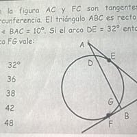 En la figura AC y FC son tagentes a la circunferencia.El triangulo ABC es rescto en B y el ∢BAC=10º.Si el arco DE=32°entonces...