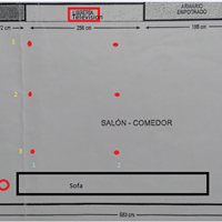 Querría preguntarles por cómo distribuir la corriente de las 9 bombillas LED en el techo (puntos rojos) de mi salón que tiene las siguientes medidas con una lámpara de pie (circulo rojo) El rectángulo negro es el sofá, el verde la mesa comedor que...