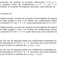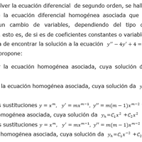Me dicen que para solucionar la ecuación diferencial de segundo orden, se halla primero la solución de la ecuación diferencial homogénea asociada que se consigue mediante un cambio de variables, dependiendo del tipo de ecuación presentada, esto es,...