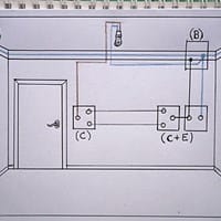Te pongo un esquema de como va conectado el circuito para poder encender y apagar desde los dos sitios, y en uno de ellos con el enchufe. Lo que tienes que tener claro es que necesitas 2 conmutadores, no te vale con 1 interruptor y 1 conmutador. La...