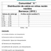 CALCULAR: a) La media aritmética con interpretación. B) Desviación media con interpretación.c) Desviación típica con interpretaciónd) Varianza con interpretación.e) Coeficiente de variación, con interpretación.f) El 2do cuartil, con interpretación.g)...