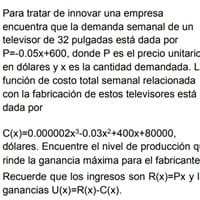 Para tratar de innovar una empresaencuentra que la demanda semanal de untelevisor de 32 pulgadas está dada porP=-0.05x+600