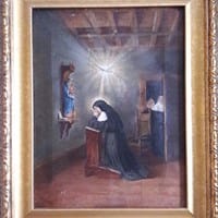 Escuela española de pps. S. XIX. Sin firma. "Monja en oración". Óleo sobre lienzo. Bastidor fijo de tipo español. Dimensiones 36 x 27,5 cm. Enmarcado con un marco actual. Restaurado con parches. La obra representa una monja con hábito de benedictina...